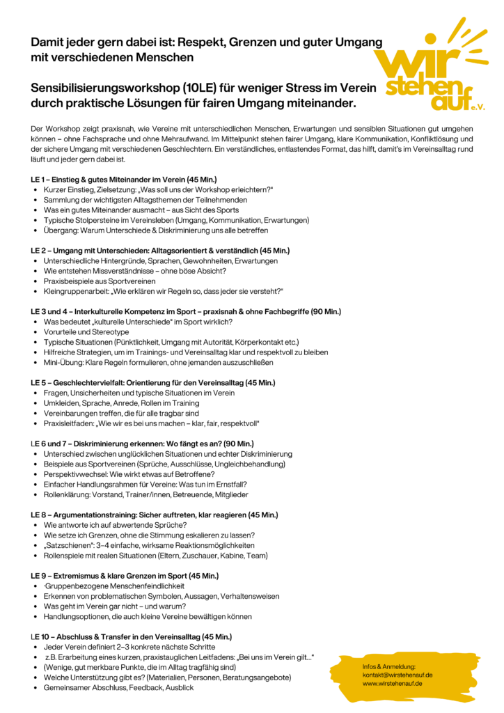 Im Workshop „Damit jeder gern dabei ist: Respekt, Grenzen und guter Umgang mit verschiedenen Menschen“ sprechen wir über Situationen, die jede/r aus dem Sport kennt: Unklare Regeln, Missverständnisse, hitzige Diskussionen, unterschiedliche Erwartungen, sensible Themen – und die Frage, wie man damit souverän, fair und ohne großen Aufwand umgehen kann.